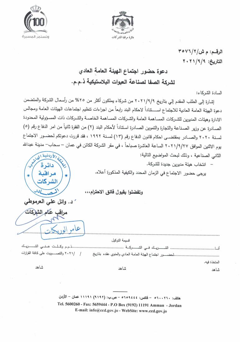 دعوة من مراقب عام الشركات للهيئة العامة للشركة لحضور اجتماع الهيئة العامة العادي المنوي عقده في مقر الشركة عمان/سحاب/مدينة عبدالله الثاني الصناعية يوم الاثنين الموافق 27/9/2021 الساعة العاشرة صباحا...