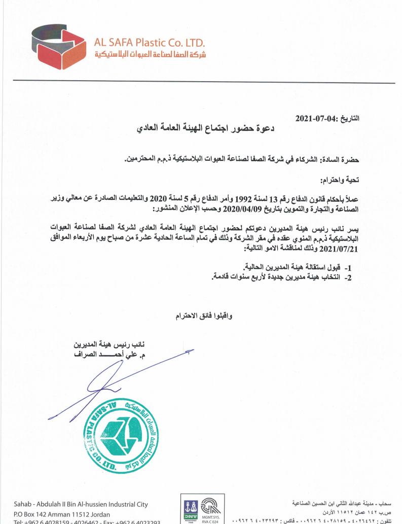 يسر ادارة الشركة دعوة السادة الشركاء لحظور اجتماع الهيئة العامة العادي المنوي عقده في مقر الشركة وذلك في تمام الساعة الحادية عشر من صباح يوم الاربعاء الموافق 21/7/2021 وذلك لمناقشة الامور التالية :
